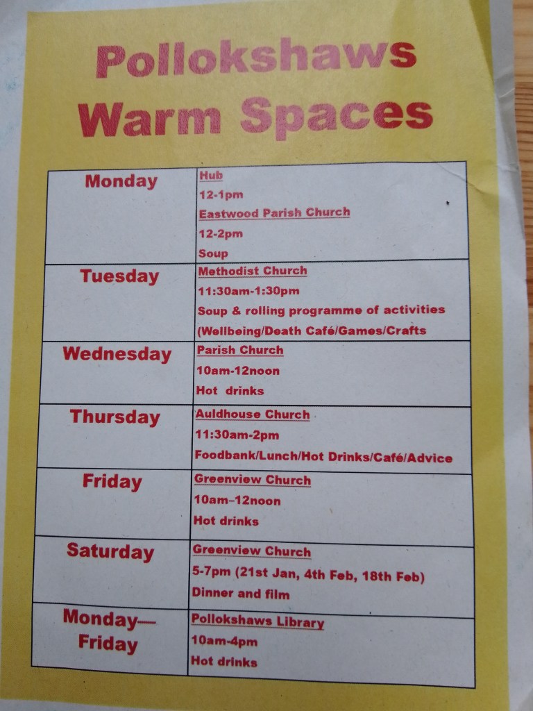 - Local libraries are welcoming folk to use them as a warm place to go – https://www.glasgowlife.org.uk/venue-finder?channel=Libraries